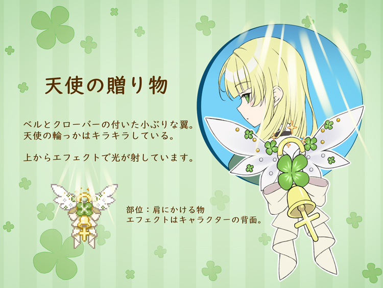- エフェクト装備のため、エフェクト(/effect)をOFFにしているとエフェクト部分が表示されません。また、養子キャラクターで装備した際、表示される位置が通常のキャラクターと異なる場合があります。