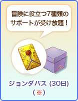 ゲーム内アイテムチケット | スペシャルキャラクタースロット解放カードの箱(1個)、 ジョンダパスの箱(30日)(1個)、 騎乗用手綱の箱(1個)、 エクストラカラーチケットの箱(1個)、 コスチュームチェンジチケットの箱(1個)、 戦闘教範75の箱(1個)、 Job教範50の箱(1個)、 身代わりの護符の箱(1個)、 ジークフリードの証の箱(3個) |